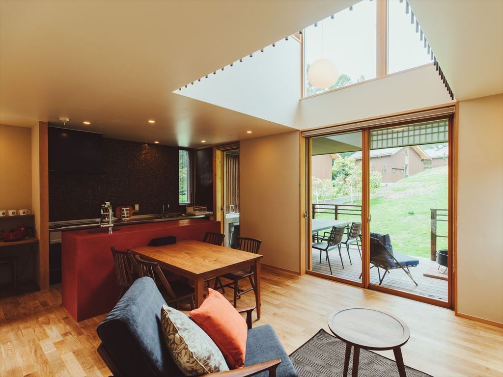 森の緑を臨める開放的なつくりのコテージです。室内には冷暖房も完備されているので、季節天候問わず、室内でもゆったりとお過ごしいただくことができます。広々としたテラスもあり、家族やグループでお食事を楽しみたい方におすすめの施設です。