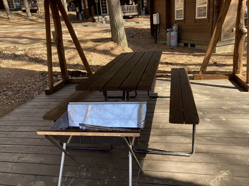 BBQテラスにはピクニックテーブルとBBQグリルが設置されているので、雨でも安心してBBQが楽します。
