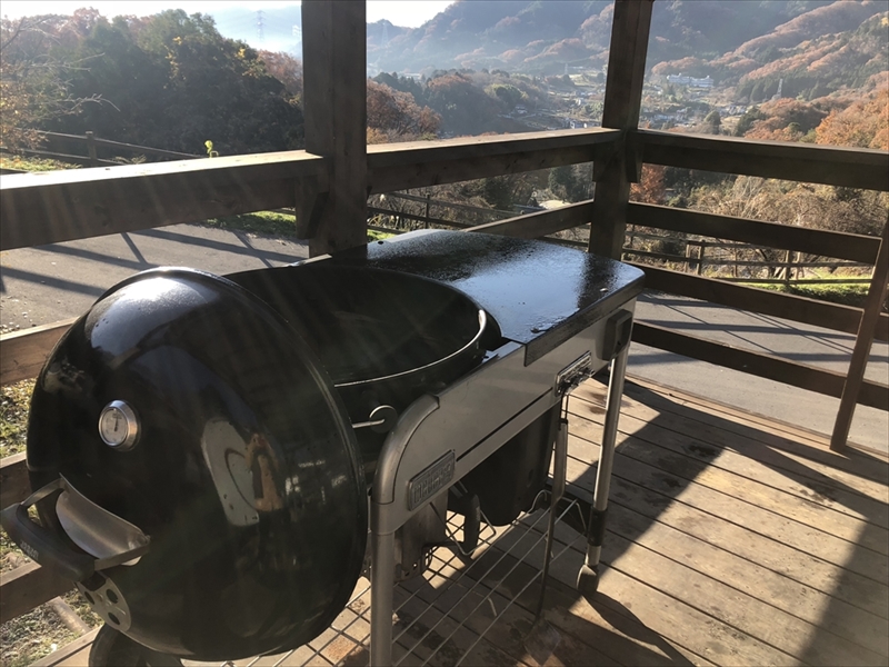 屋根のあるデッキテラスでは、テーブルに付属したグリルでBBQも楽しめます。