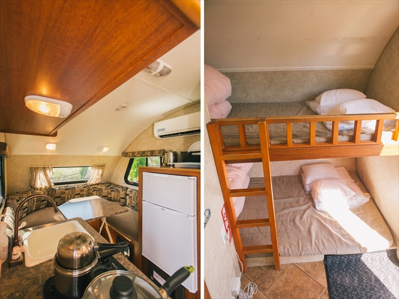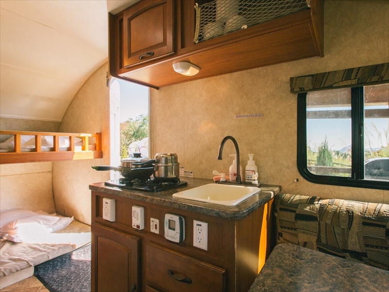 見晴らしがよいスリーパーエリアに位置するトレーラーハウス。水回りはもちろん、ロフトも備わり、内装はまるで一軒家のようなつくりになています。